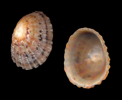 Patella vulgata radiata (f) Perry, 1811 Collected at low tide fresh on beach; Surville Plage, Surville, Cotentin, Normandie, France; September 2009