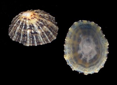 Patella vulgata Linnaeus, 1758 Collected at low tide fresh on beach; Surville Plage, Surville, Cotentin, Normandie, France; September 2009