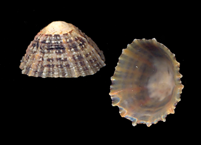 Patella vulgata radiata (f) Perry, 1811 Collected at low tide fresh on beach; Surville Plage, Surville, Cotentin, Normandie, France; September 2009