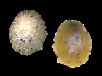 Patella vulgata Linnaeus, 1758 Collected at low tide fresh on beach; Surville Plage, Surville, Cotentin, Normandie, France; September 2009