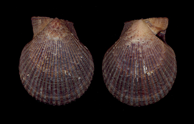 Mimachlamys varia major (f) (Locard, E.A.A., 1888) Trawled at 25 meters; off Pointe du Chevet, Saint Jacut de la Mer, French Brittany, France; collected 15. February 2004